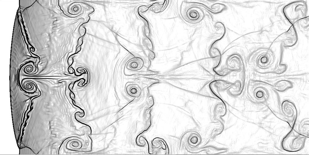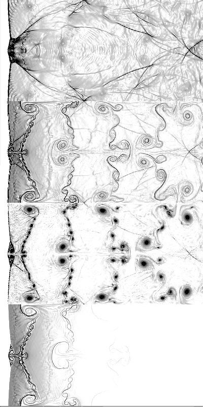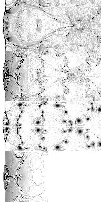 The following results were obtained using a direction split FCT code with single step chemistry and Arrhenius kinetics. The pictures are plots of (from top to bottom) pressure gradient, temperature gradient, vorticity, and gradient of fuel mass fraction. The pictures obtained for overdrive 1.2, activation temperature 10 and heat release parameter 50. They are smoother than other results because in these computations, grid jiggling was used on the 1000 by 500 grid.