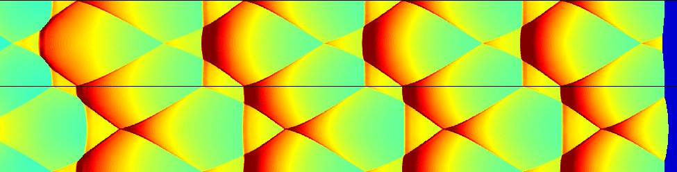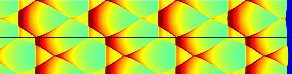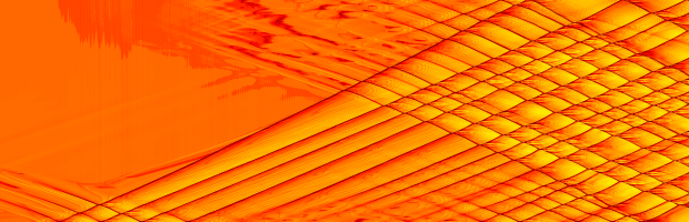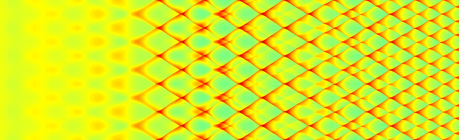 Fortunately, we can easily generate the same "smoked-foil" effect numerically. All this requires is to track the leading shock position and pressure as a function of time. Then we just plot this on a two-dimensional grid to give the results below.