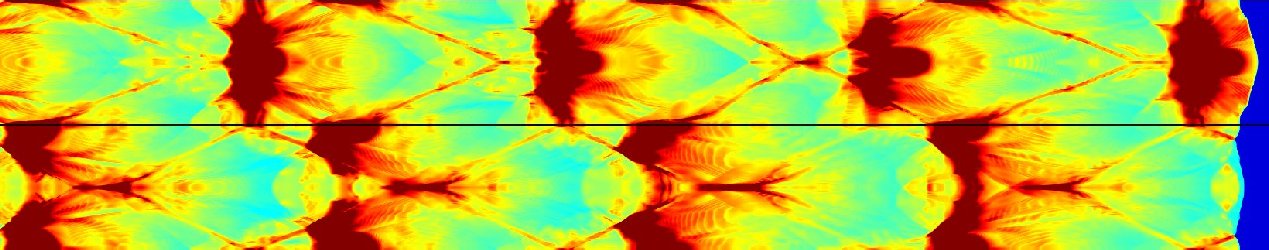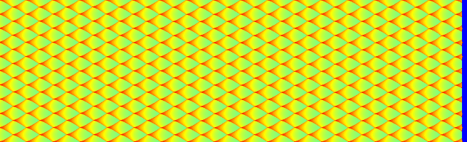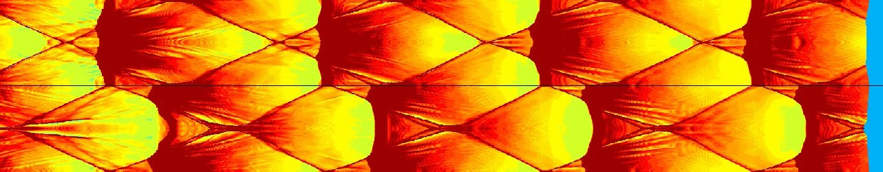 This case has fairly periodic cell structure The detonation starts out at the left hand side of the top picture, and propagates to the right. The second and third pictures are a direct continuation of the first. Out of the five complete cells in this series, the initial perturbation has the most effect on the first two. It finally merges with the main transverse waves about two thirds of the way through the second cell. By the third cell in the series, the detonation seems to be in its final state.