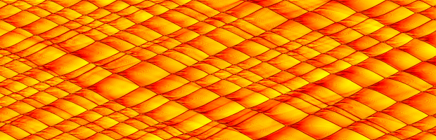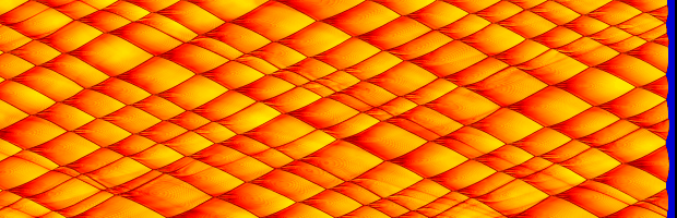 The following two pictures were generated for the same dimensionless paramaters as used in the two dimensional cases above. Two grid resolution were used, 16 and 32 mesh points per ZND half-reaction length. The major difference to note in the following numerical smoke foils is the presence of the slapping wave.